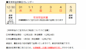 休業期間中は、お電話・メールでのお問い合わせ対応および商品の出荷をお休みさせていただきます。